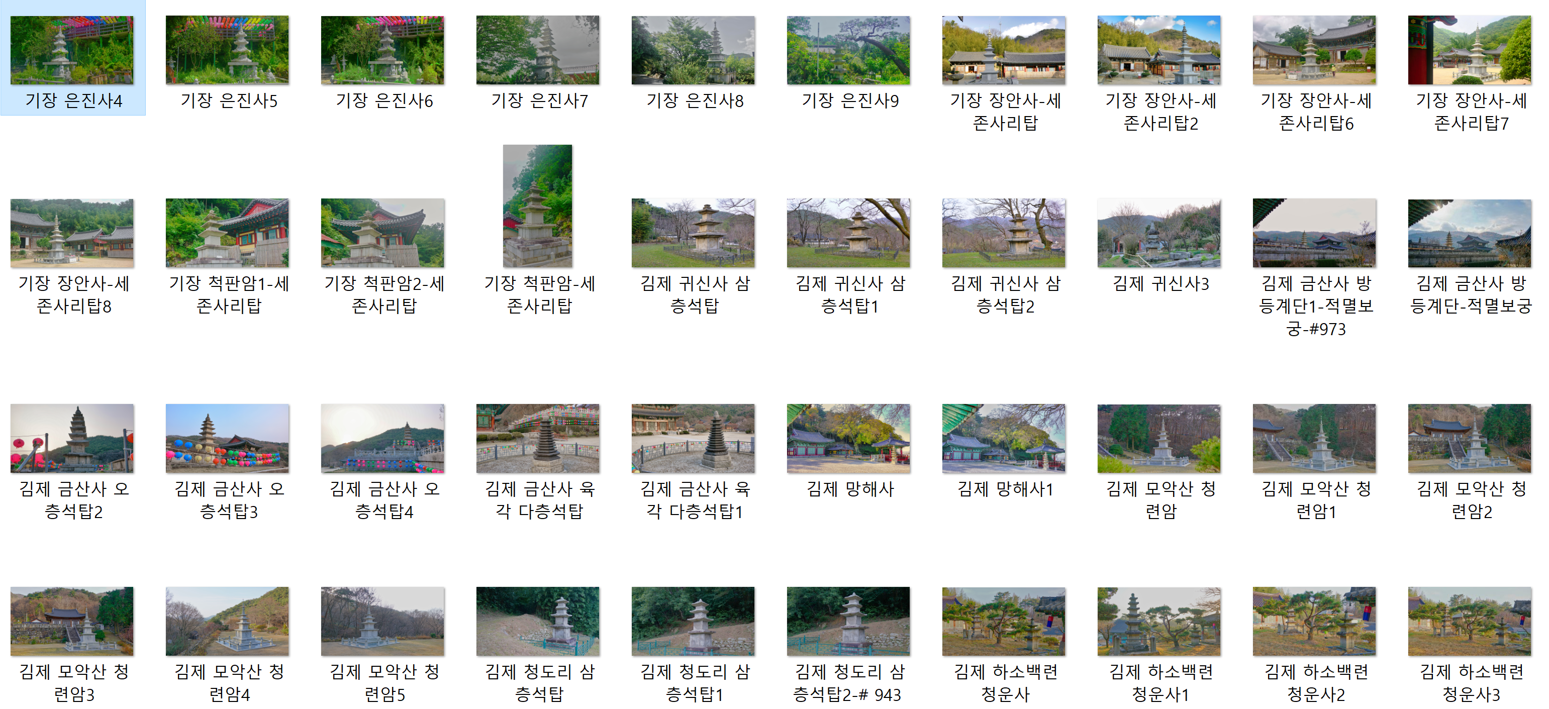 24. 기장 은진사-기장 장안사 세존사리탑-기장 척판암 세존 사리탑- 김제 귀신사 삼층석탑-김제 금산사 방등계단-김제 금산사 오층석탑-김제 금산사 육각 다층석탑-김제 망해사-김제 모악산 청련암-김제 청도리-김제 하소백련 청운사 -